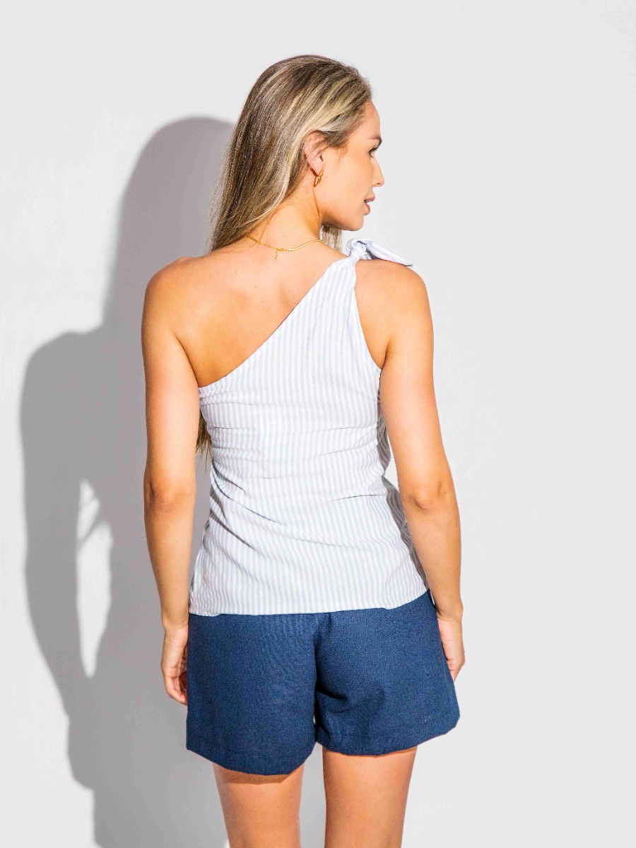 Blusa Reisen De Um Ombro Só com Laço Listrada Azul e Branco