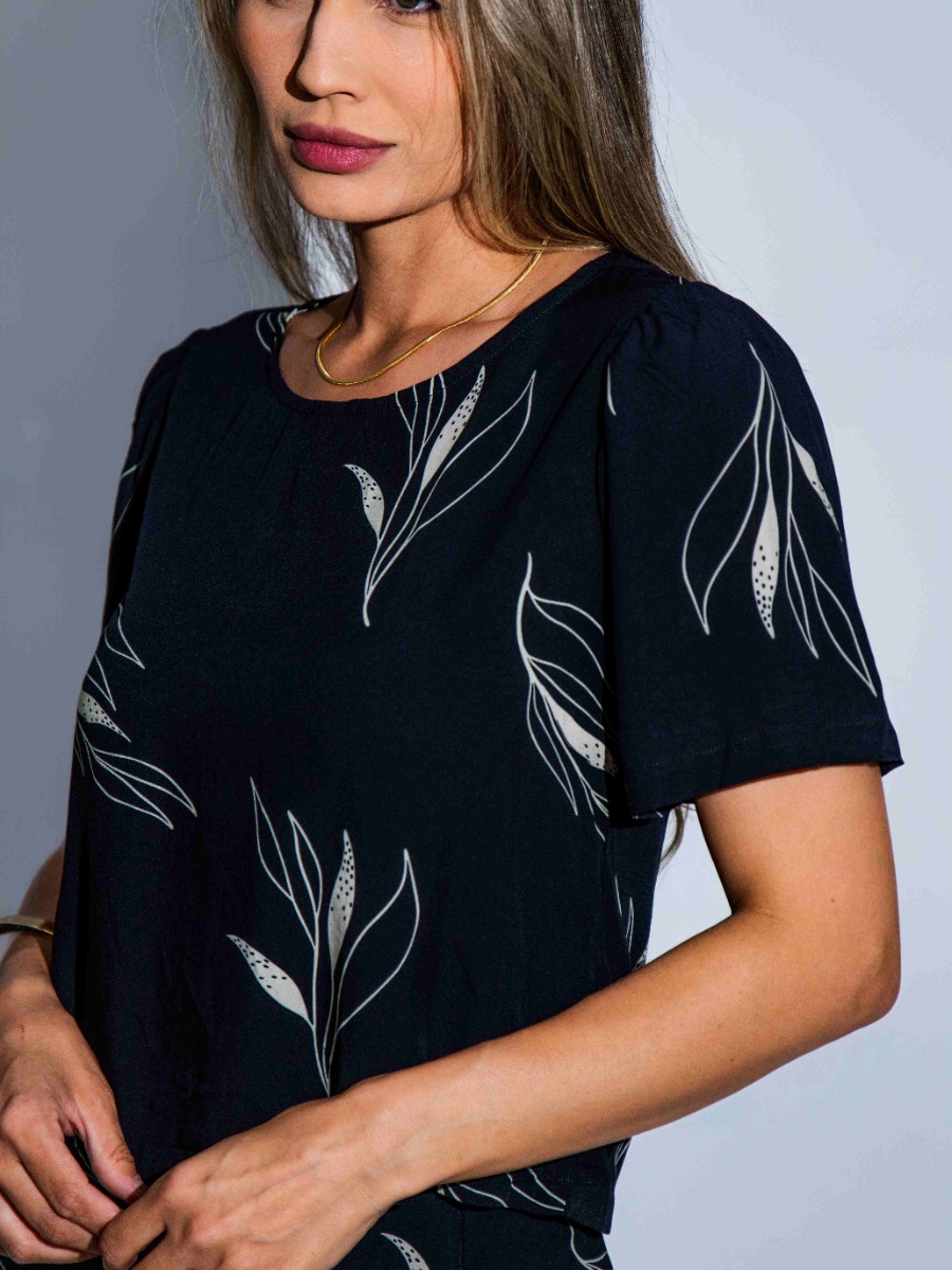 Blusa Reisen Estampada com Manga Curta Drapeada Preto