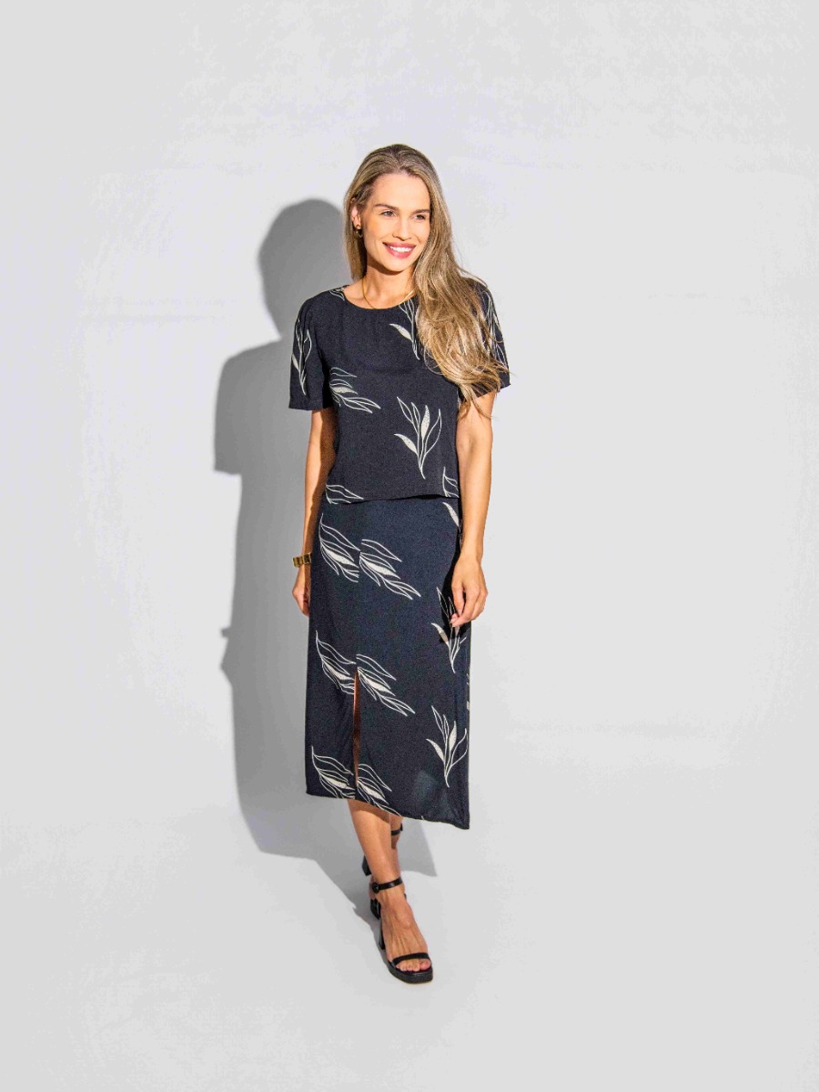 O tecido fluido valoriza o movimento e a estampa exclusiva adiciona elegância e personalidade ao look.