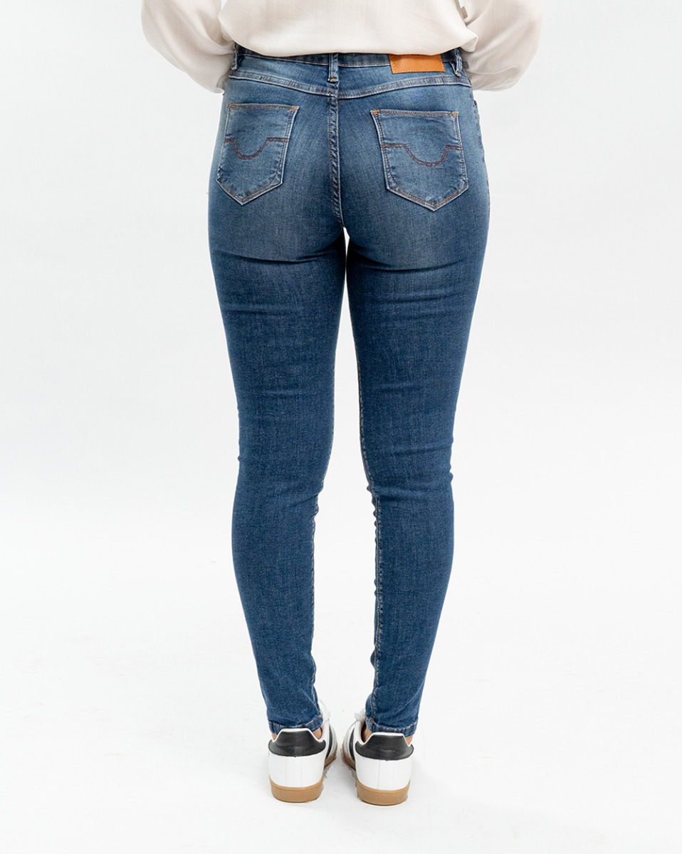 A Calça Jeans Skinny Reisen em tom médio é a escolha perfeita para quem busca um visual moderno e confortável.
