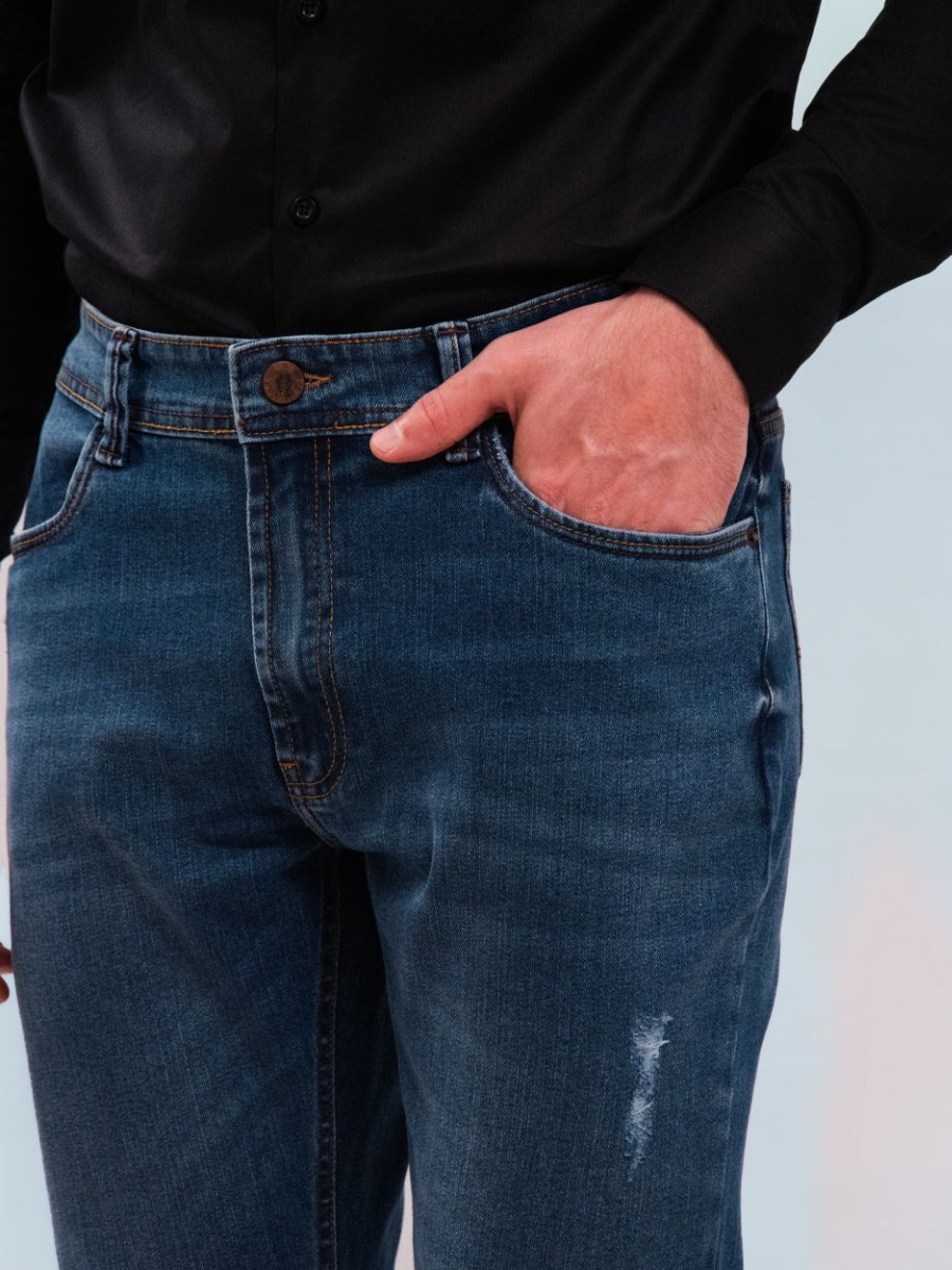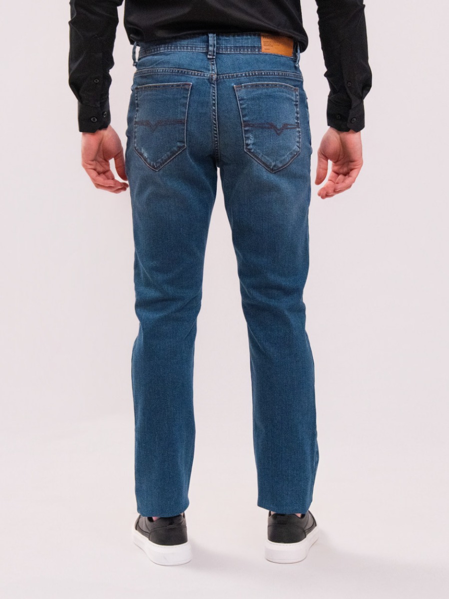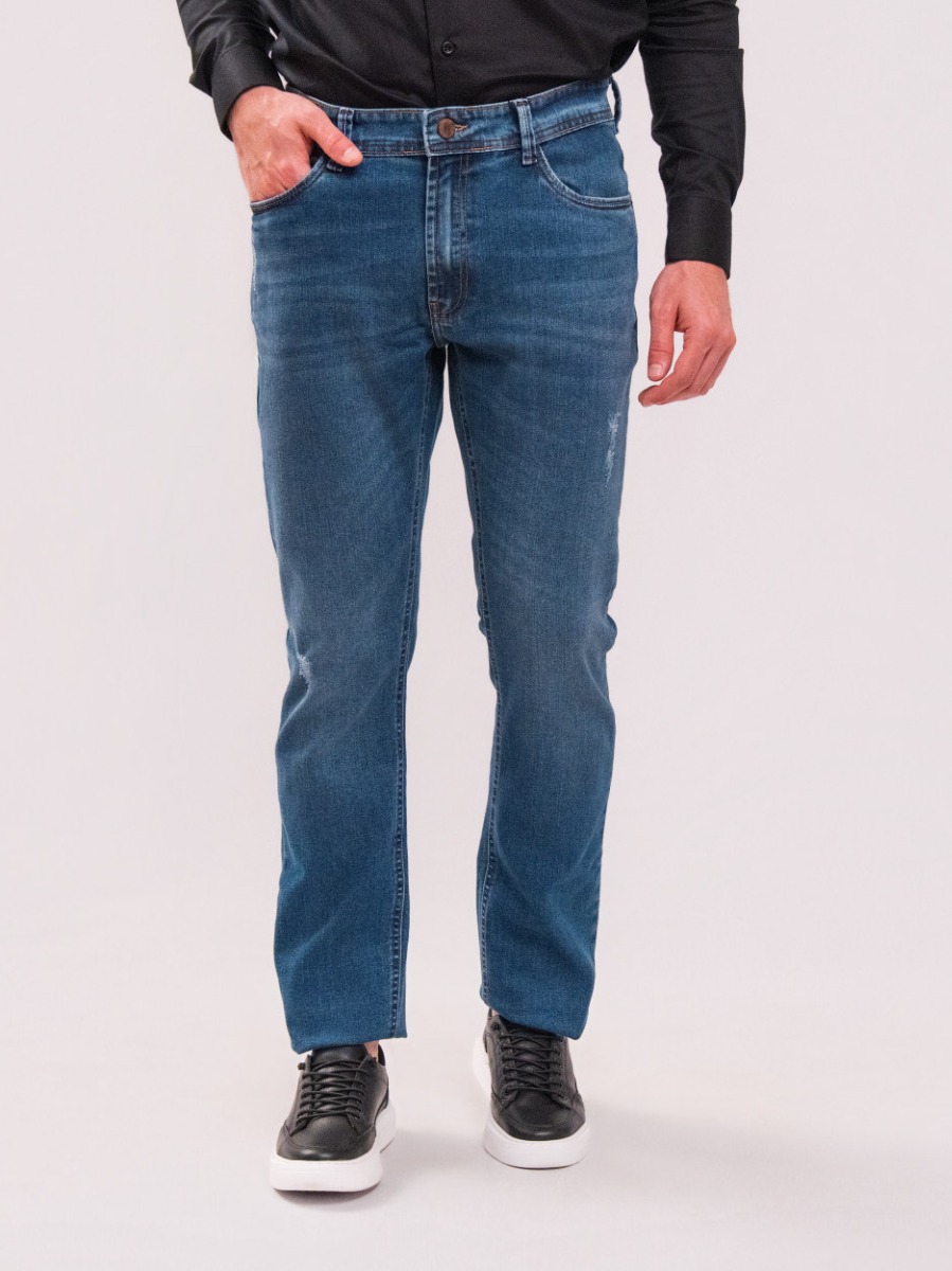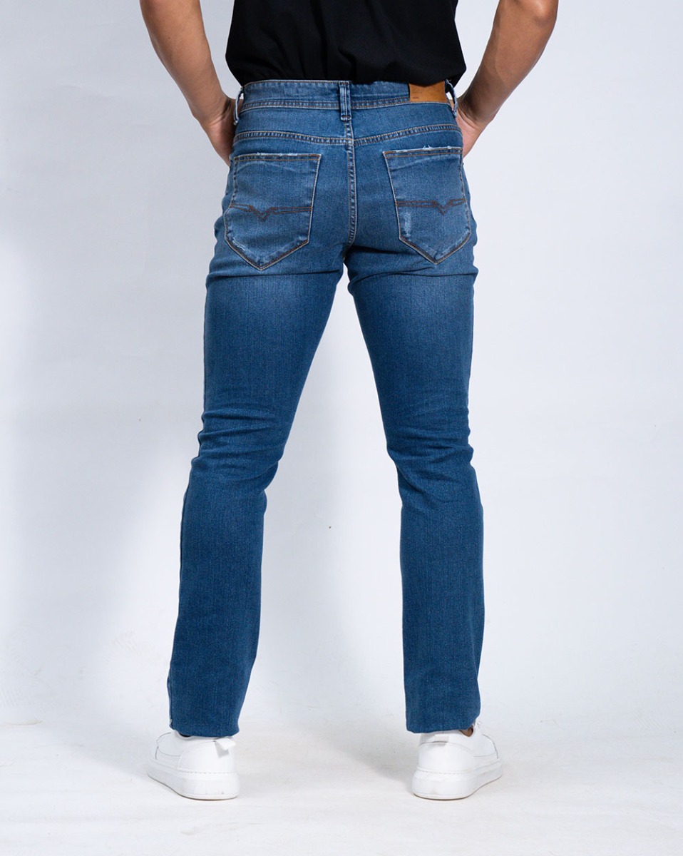A Calça Jeans Reisen Slim na cor média, com puídos estrategicamente posicionados, traz um toque de ousadia e personalidade ao seu visual.