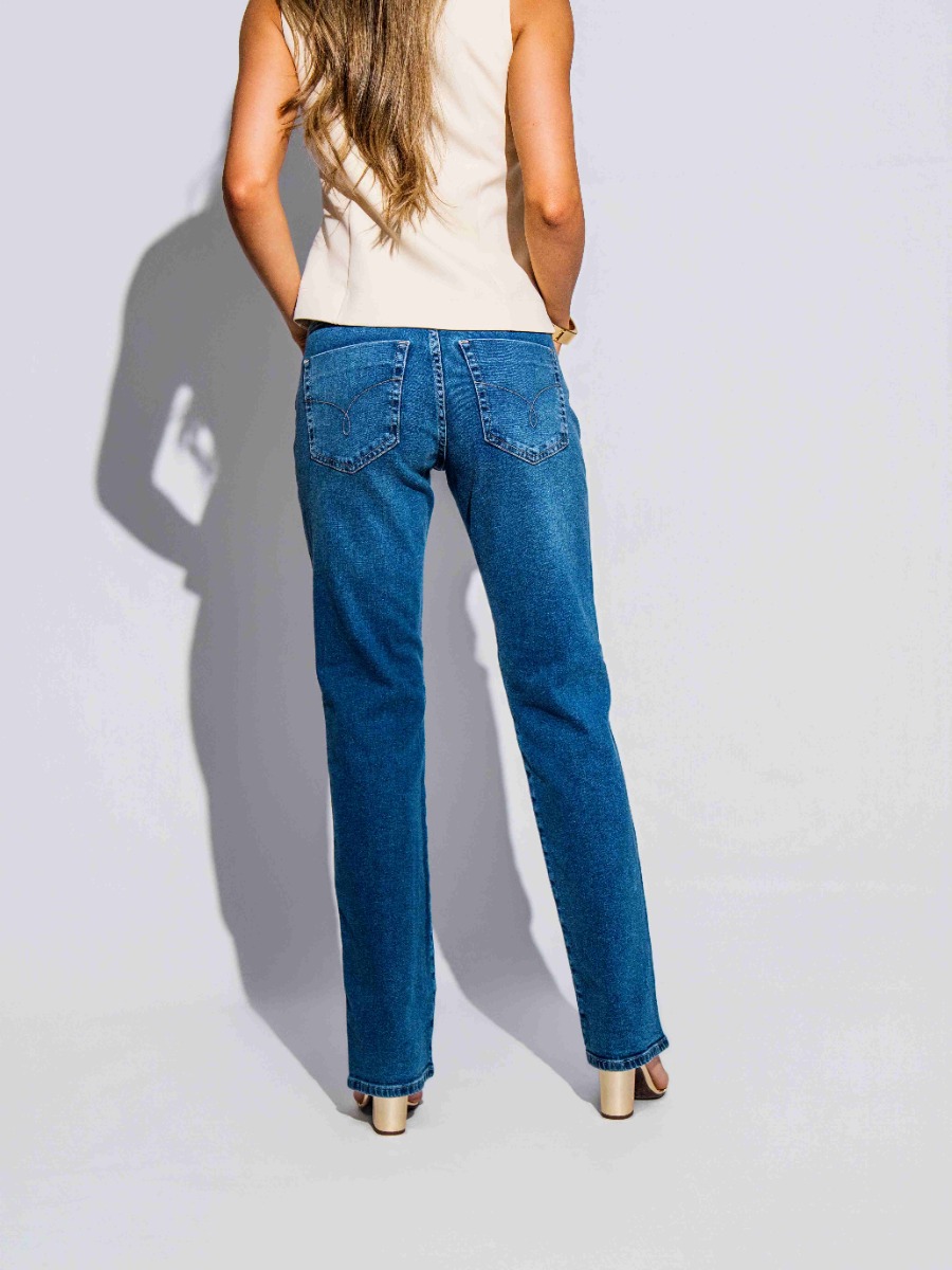 Calça jeans feminina com modelagem reta e cintura alta, perfeita