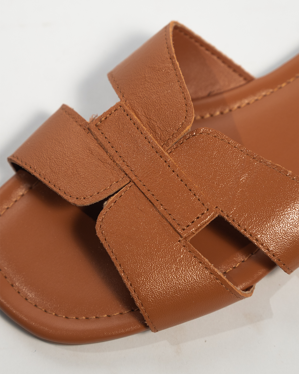 Seu cabedal em couro garante resistência e durabilidade, enquanto o design minimalista com tiras largas proporciona conforto e versatilidade.