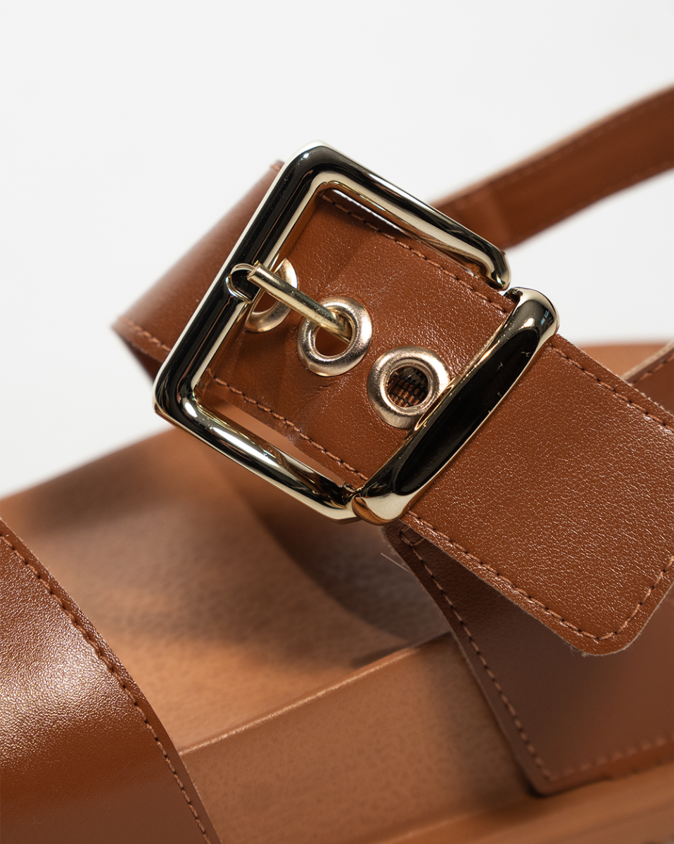O design moderno com tiras largas e maxi fivela dourada adiciona estilo e personalidade ao look.