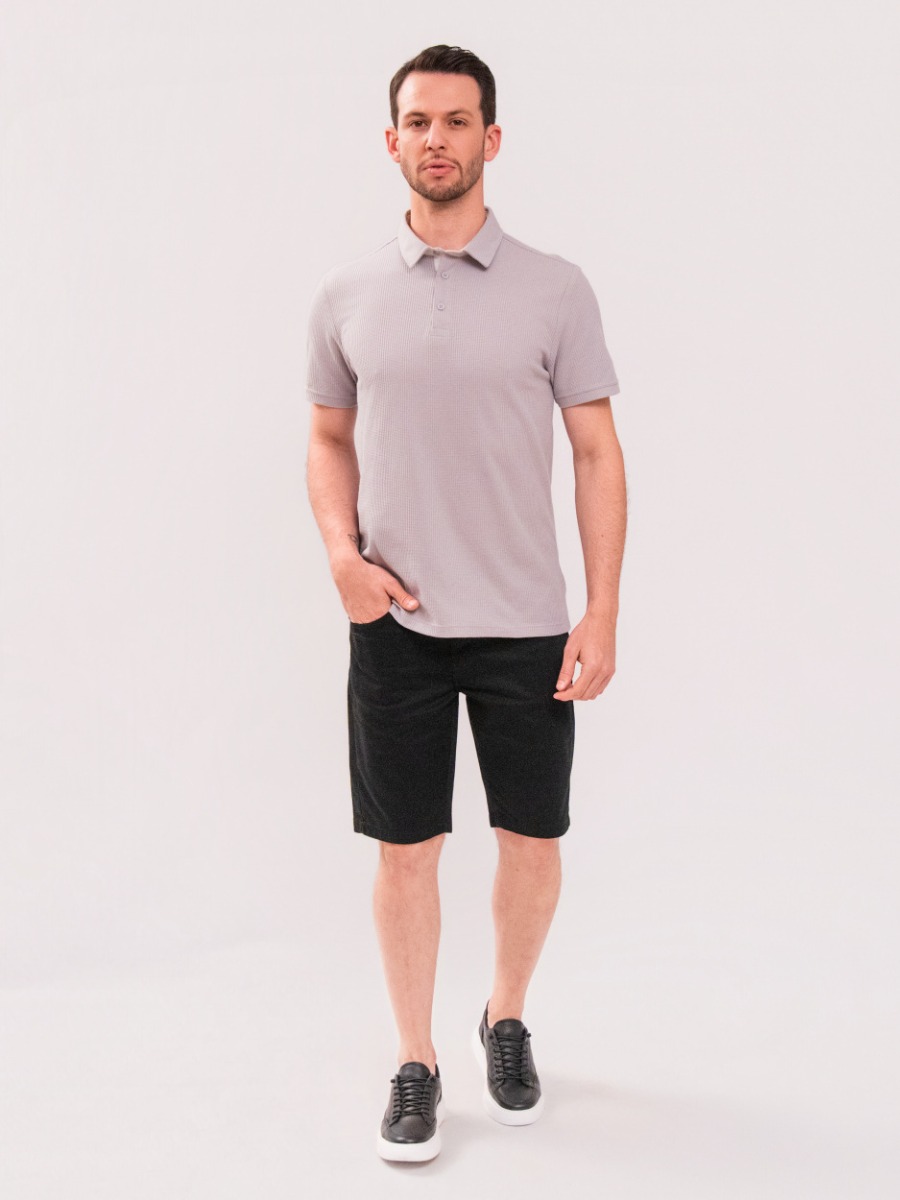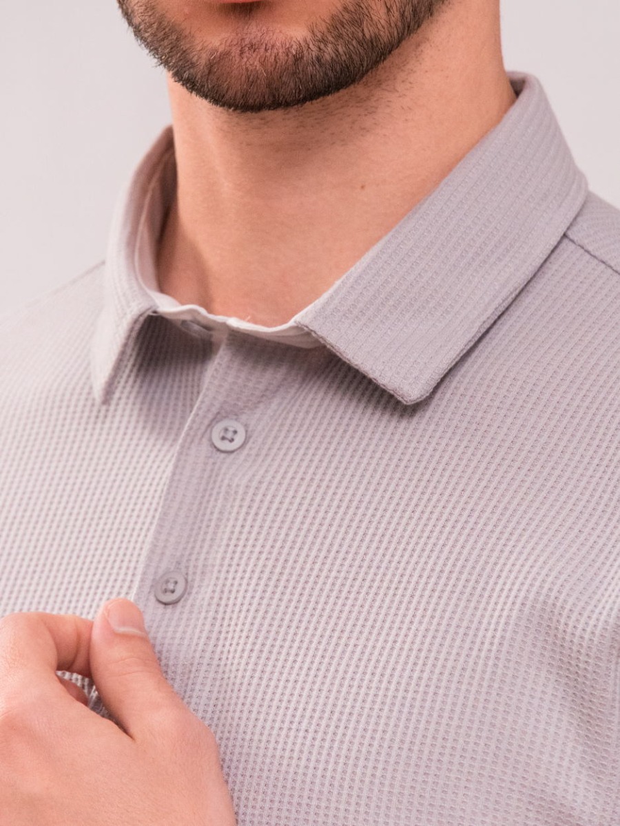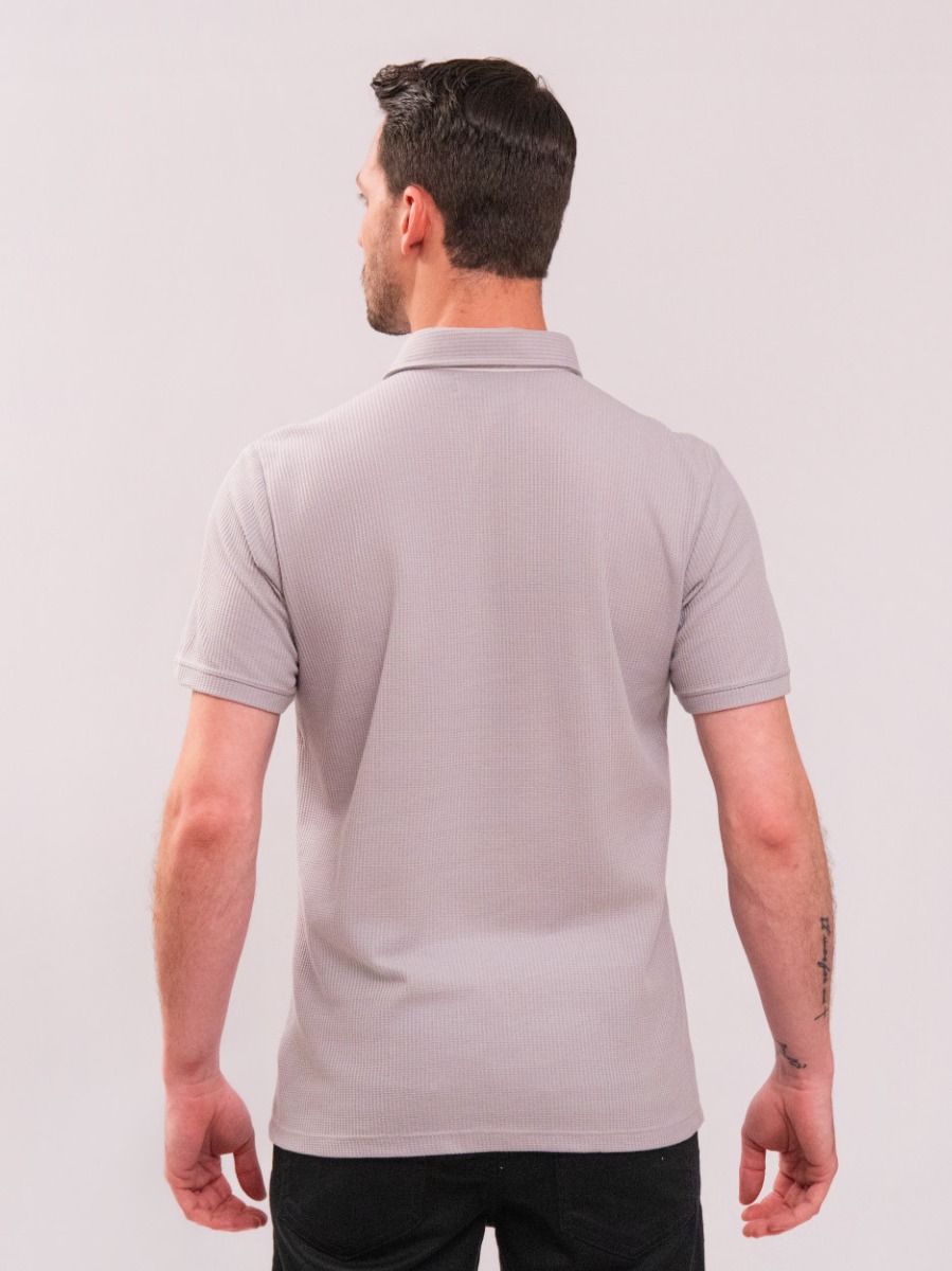 A polo masculina cinza com textura Reisen une elegância e conforto em um design contemporâneo.