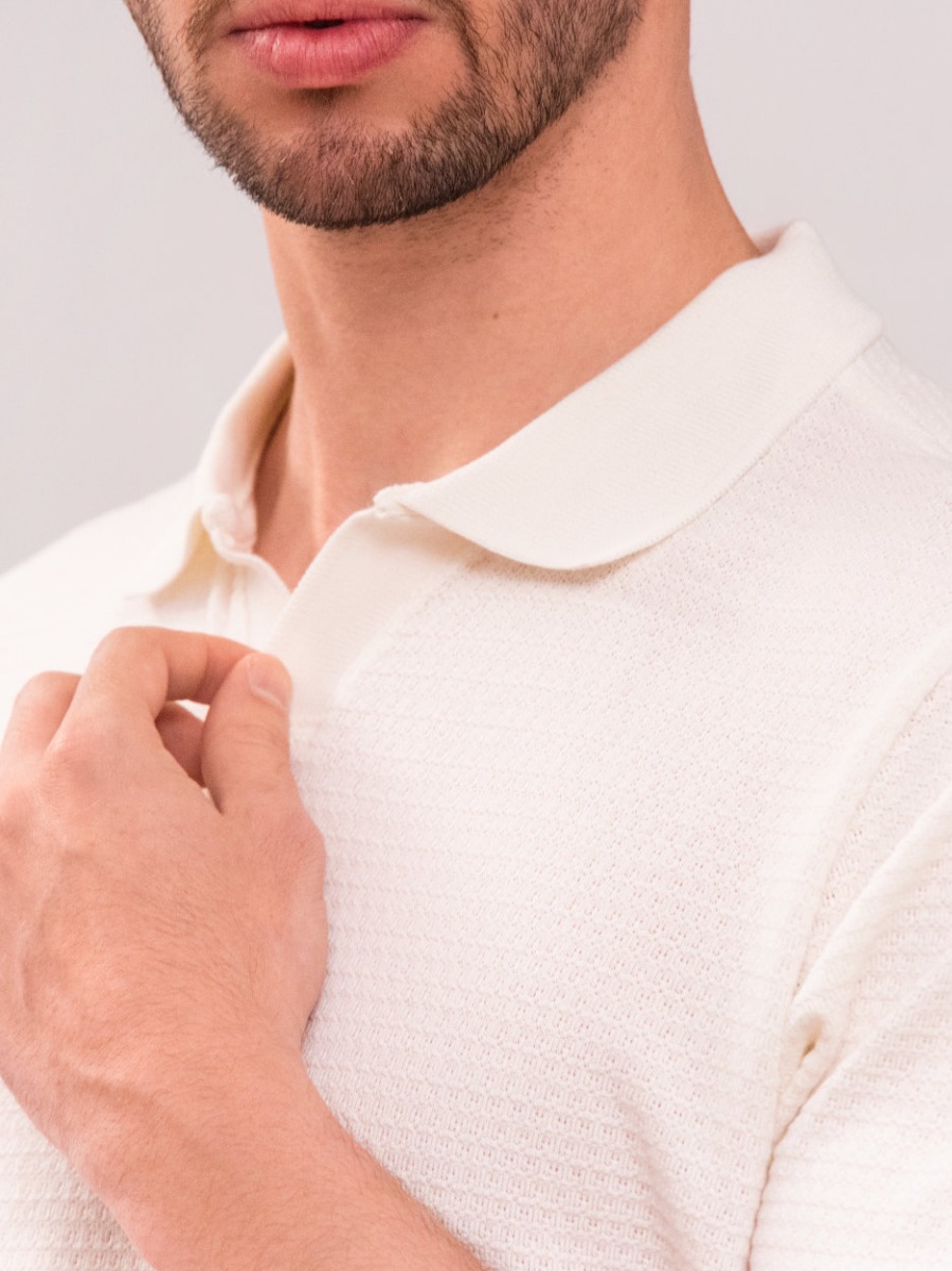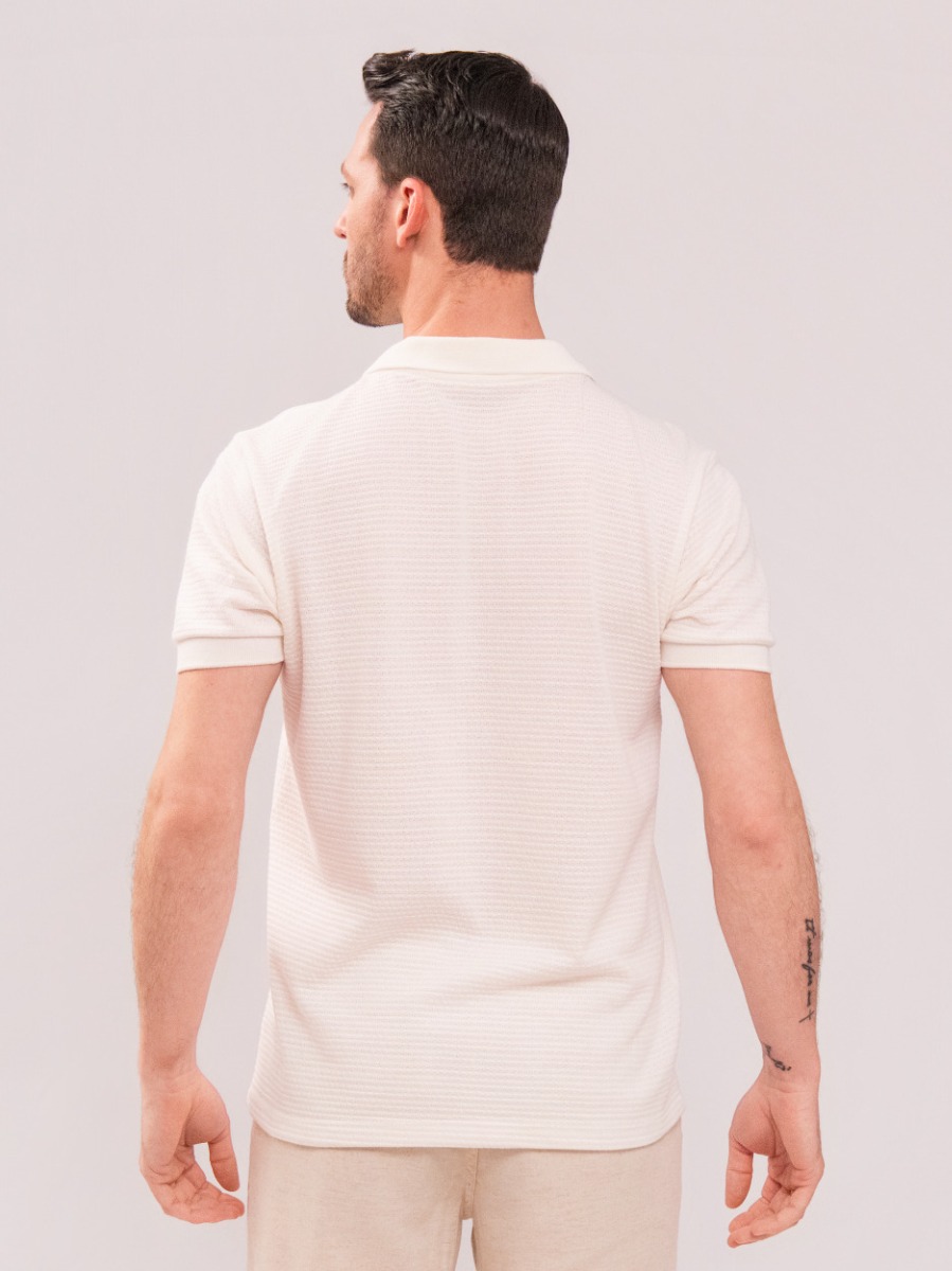 A polo masculina off white com textura Reisen une sofisticação e conforto em um design moderno e elegante.