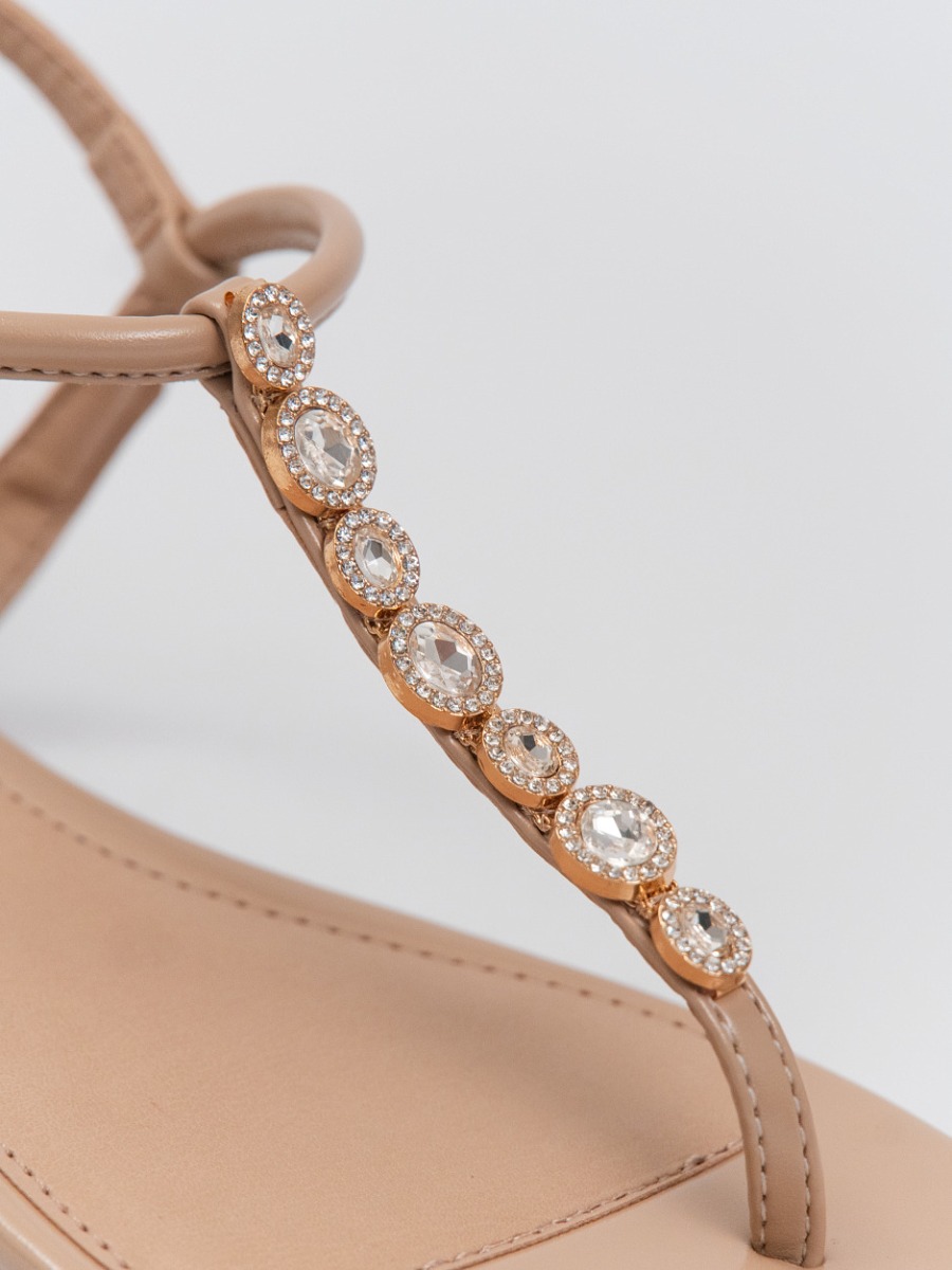 Confeccionada em couro de alta qualidade, possui tiras delicadas com aplicação de pedrarias brilhantes, bordadas à mão, que adicionam um toque sofisticado ao visual.
