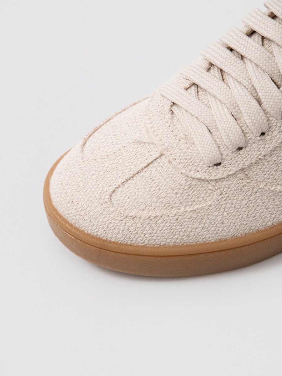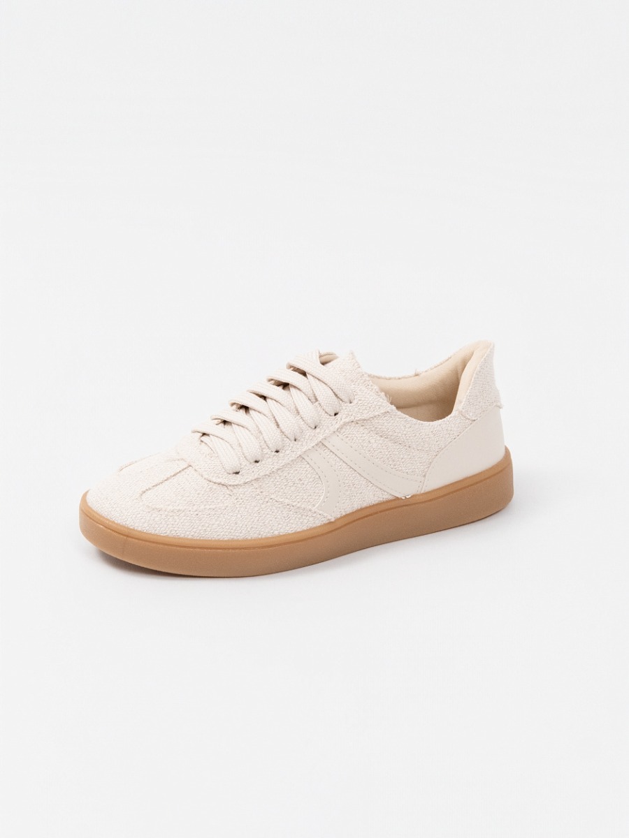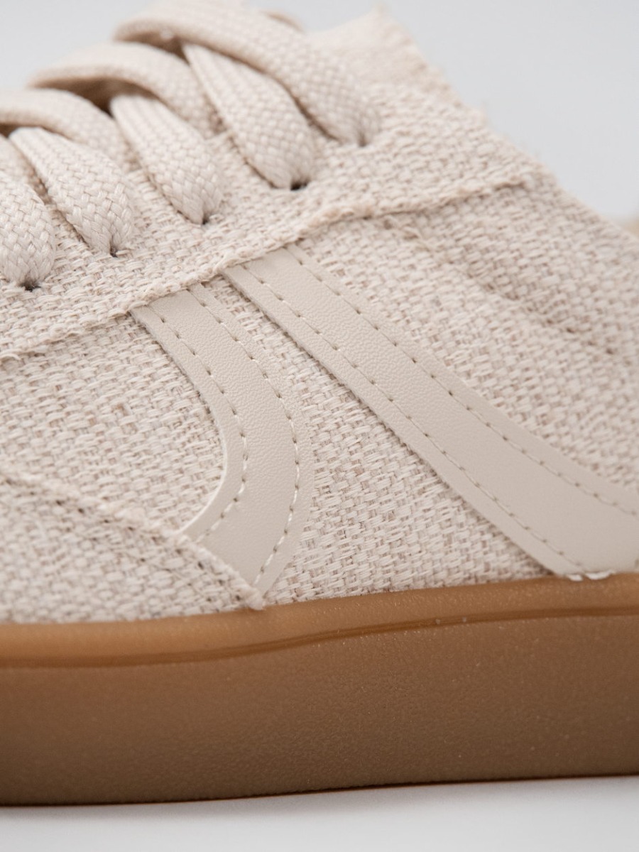 Confeccionado em material têxtil com textura suave, possui solado emborrachado caramelo que garante conforto e aderência.