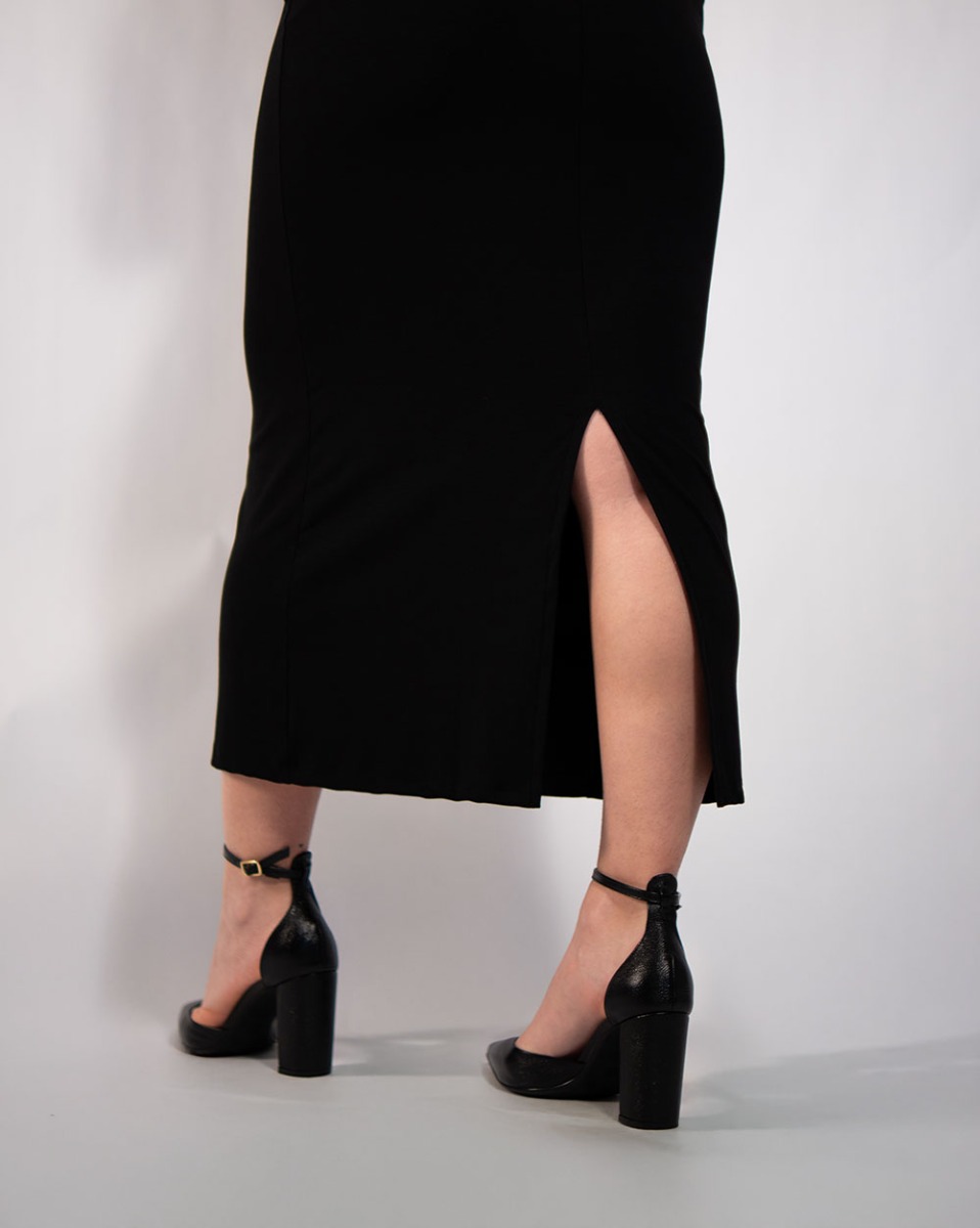 Produzido em tecido confortável e de excelente caimento, o vestido conta com comprimento midi, fenda discreta nas costas para facilitar os movimentos e acabamento impecável.