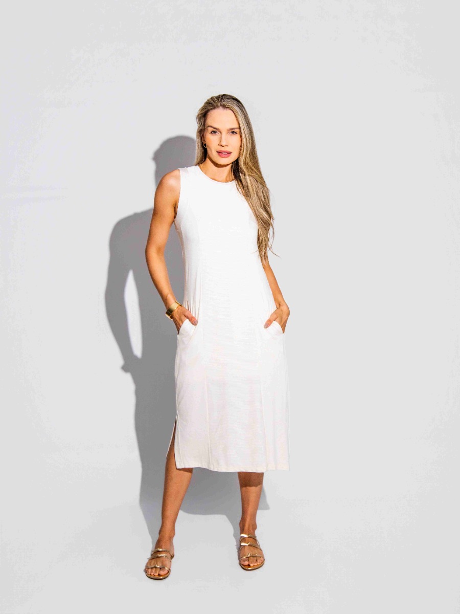 Com modelagem midi, gola redonda e design sem mangas, é uma peça moderna e versátil para compor looks casuais ou urbanos.